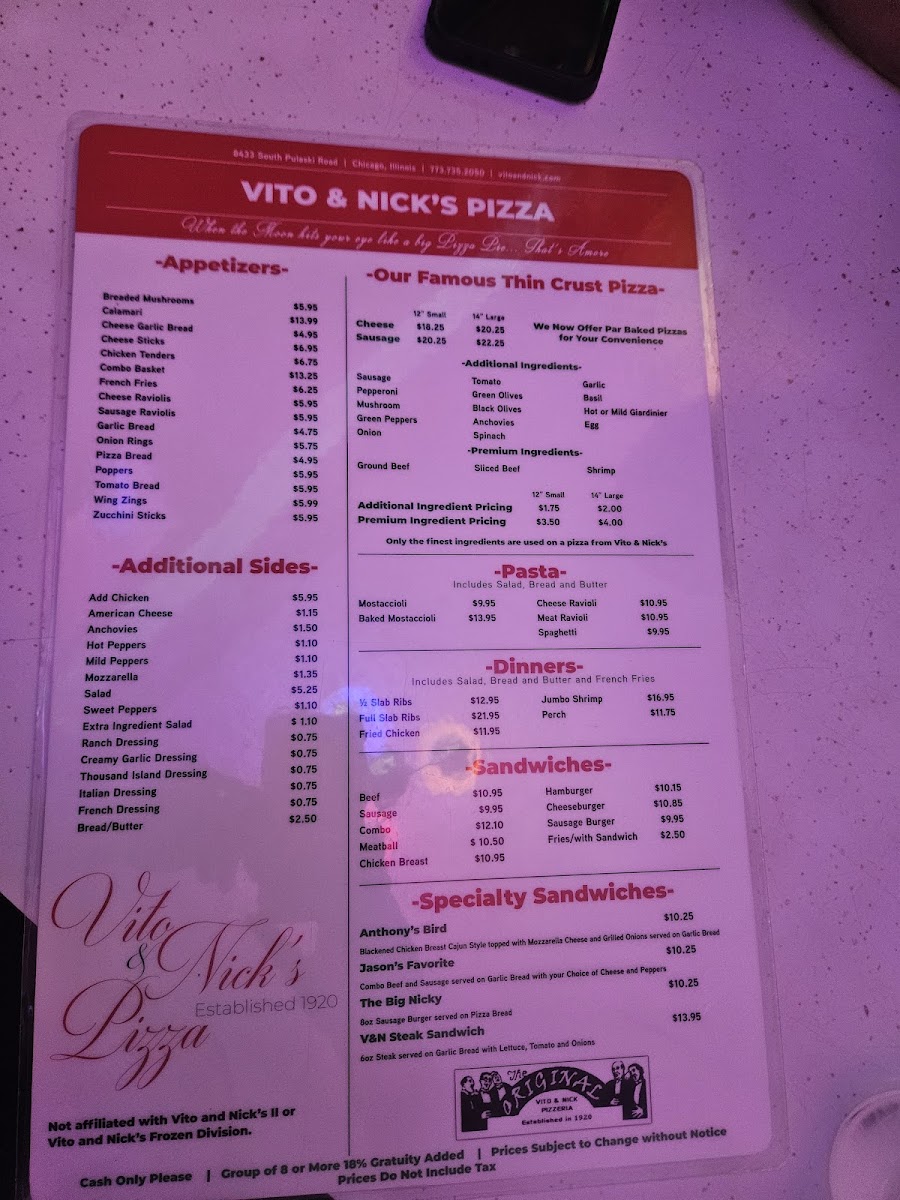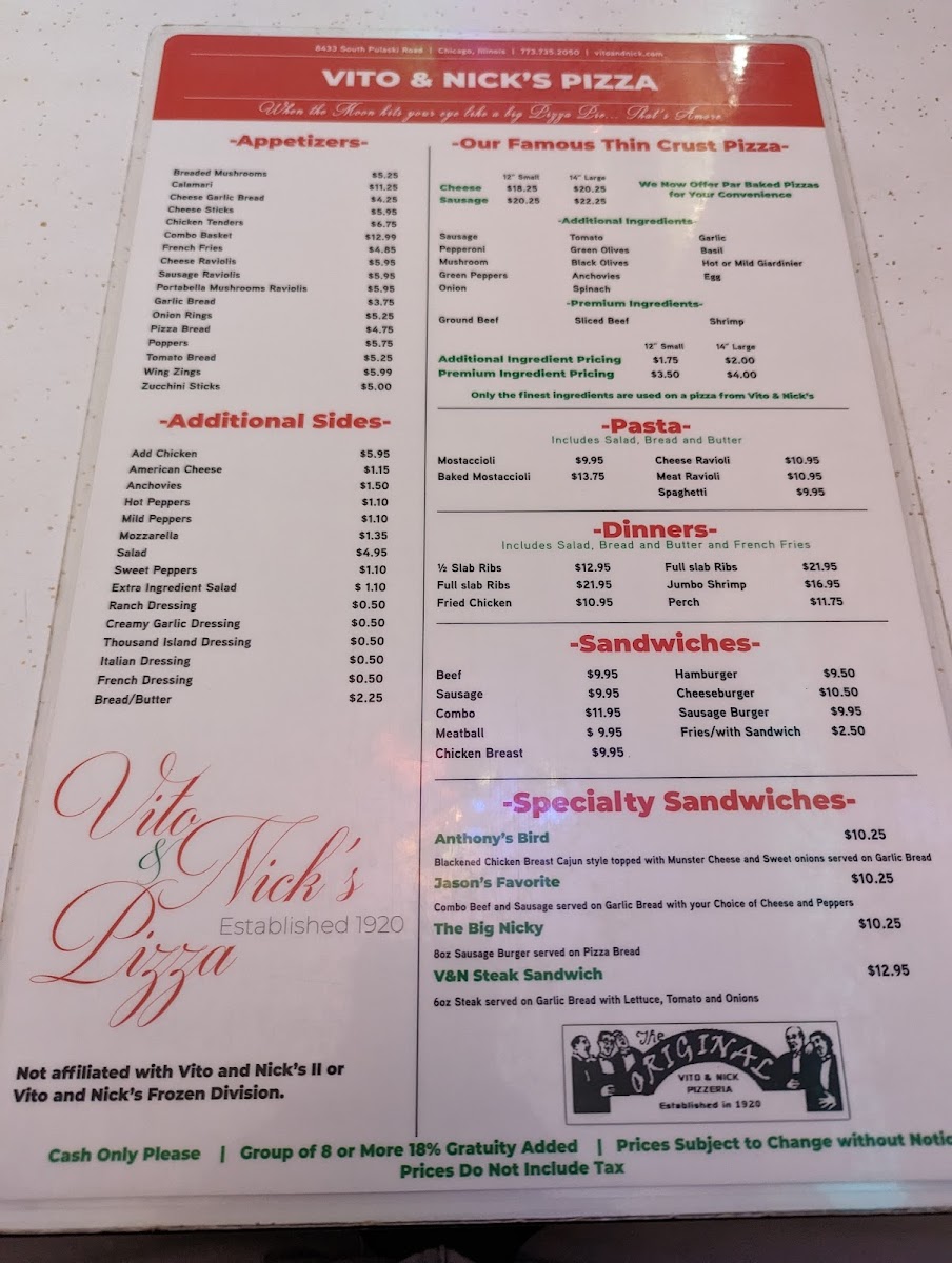 If you find yourself in Chicago and are in search of the quintessential pizza experience, look no further than Vito & Nick's Pizzeria. Nestled at 8433 S Pulaski Rd, this local gem specializes in Chicago's famous thin-crust tavern-style pizza that has been delighting taste buds for over a century. With a dedicated following and a reputation that precedes it, Vito & Nick’s is more than just a pizzeria; it’s a beloved Chicago institution.